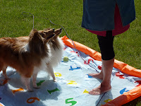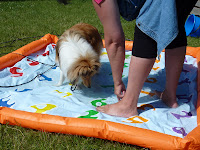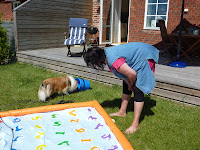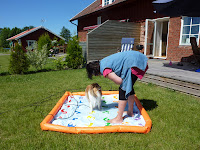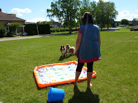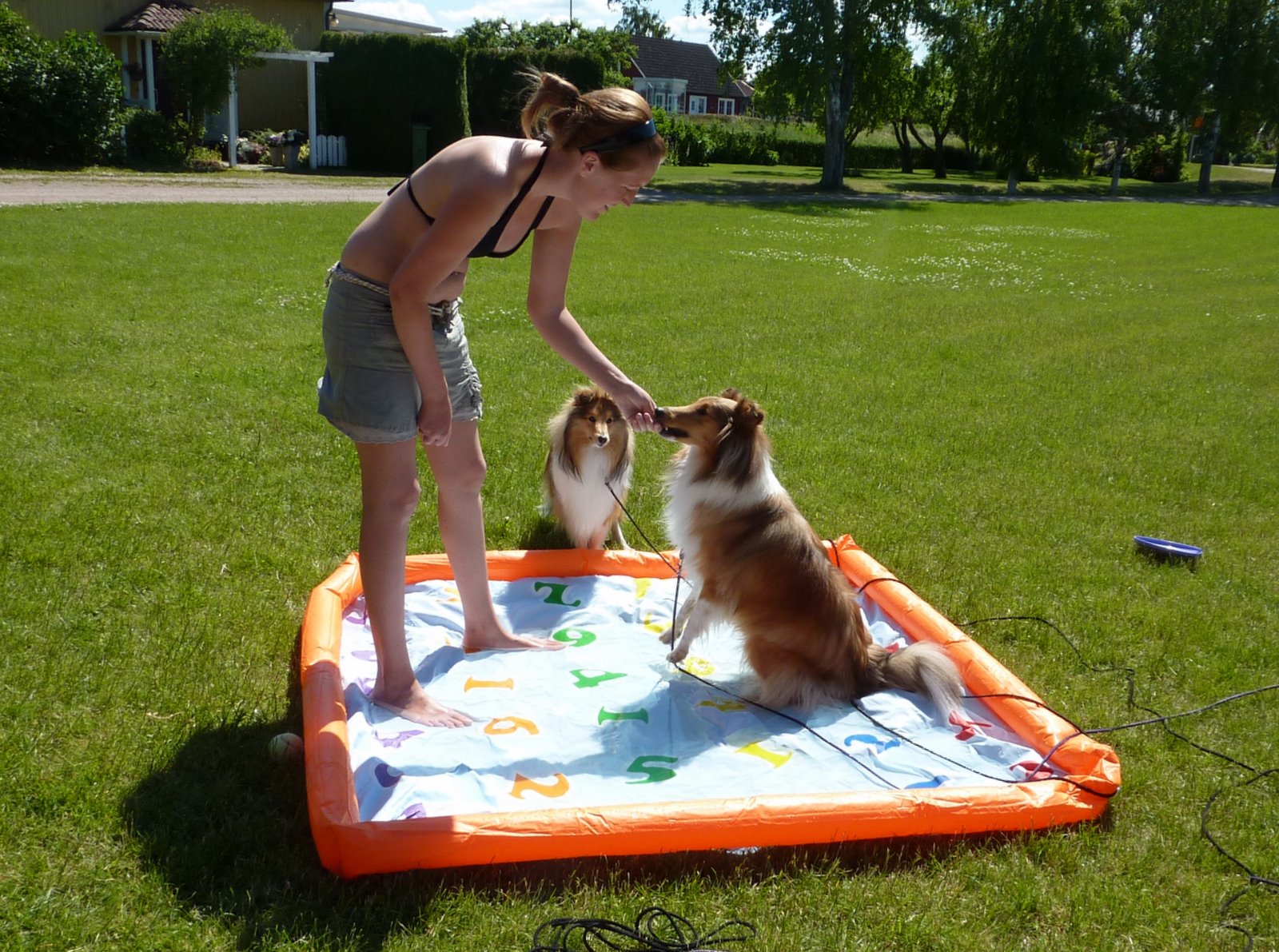 Vadå bada pool?? Hemma så blev det sen på eftermiddagen, att vi tog vara på solen.Stålande sol och underbart och jag ville ha lite mer färg igen.Mamma hade köpt en liten barn pool på ÖoB, så den blåste jag upp.Inte mkt att blåsa som tur var. Denna skulle hundarna ha för svalkning.Detta var nytt för Alwin, som ju aldrig badat mer än i duschen...Så jag ställde mig i poolen och sen lockade i honom.Fick ta den takt det tog, eftersom det var förtroende jag ville få fram.Att han litar på mig och gör detta i sin egna takt.