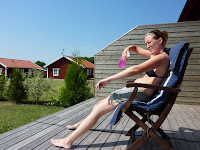 MåndagenJag tog vara på solen i måndags. Skulle ju resa hem till Norrköping samma kväll. Det blev en glass på verandan, men bytte sen om till bikini och kjol,satte mig därefter ute på verandan igen och försökte njuta av sol och utsikt.Det var väldigt varmt även denna dag, så hade sprayflaska med kallt vatten i.Har jag använt nästan varje dag för svalkning.