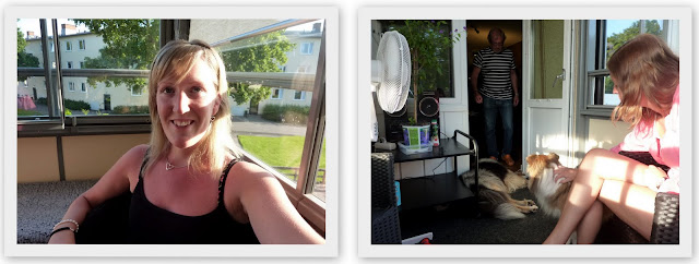 Sen satte oss ute på balkongen med golvfläkt. Väldigt varm dag var det.